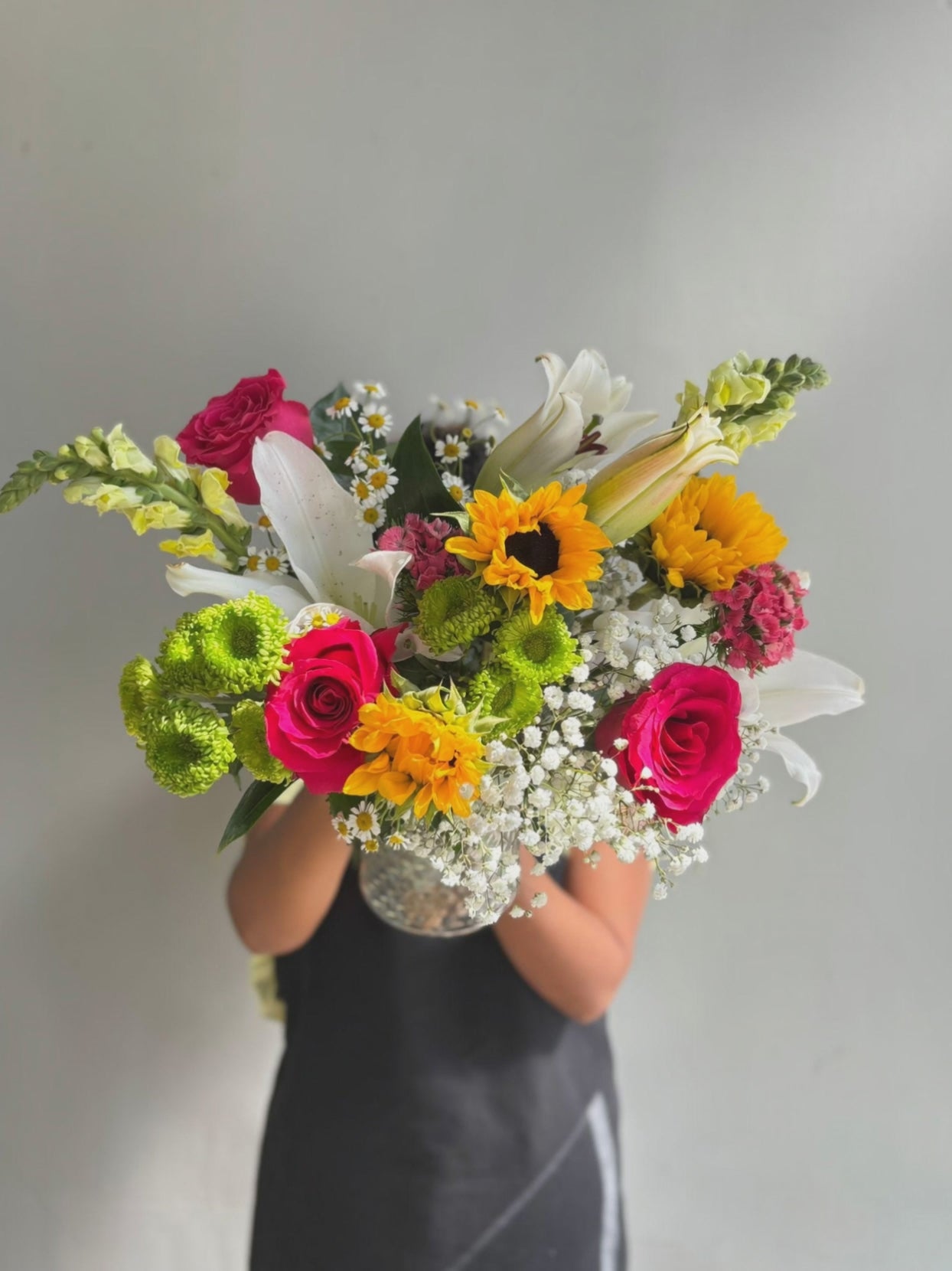 Introducing our Colourful Mixed Flower Vase, a stunning display featuring a delightful combination of lilies, roses, and sunflowers in a chic clear vase. This vibrant arrangement brings a burst of color and joy to any setting, making it an ideal gift or decor piece for any occasion.