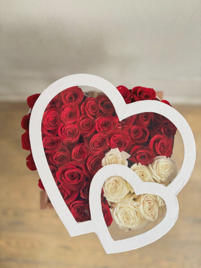 A stunning flower box designed in the shape of two hearts, beautifully combined into one elegant arrangement. The smaller heart is delicately filled with pure white roses, symbolizing sincerity and grace, while the larger heart overflows with rich red roses, representing deep love and passion. Together in one luxurious box, this dual-heart floral design creates a powerful expression of romance, making it a perfect gift for anniversaries, Valentine’s Day, or any heartfelt occasion.