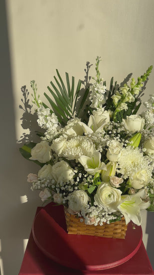 Let this exquisite composition of beautiful white blossoms deliver your sympathy and comfort loved ones grieving a loss. The elegance of this arrangement and its warm, homey basket base makes it an appropriate addition to any wake, funeral or graveside service, or to send to the home of family or friends. Handcrafted by a local FTD artisan florist of individually selected white roses, stock, cushion pompons and larkspur set among complementary greens for a memorable bouquet that evokes a tranquil sense of heavenly hope.